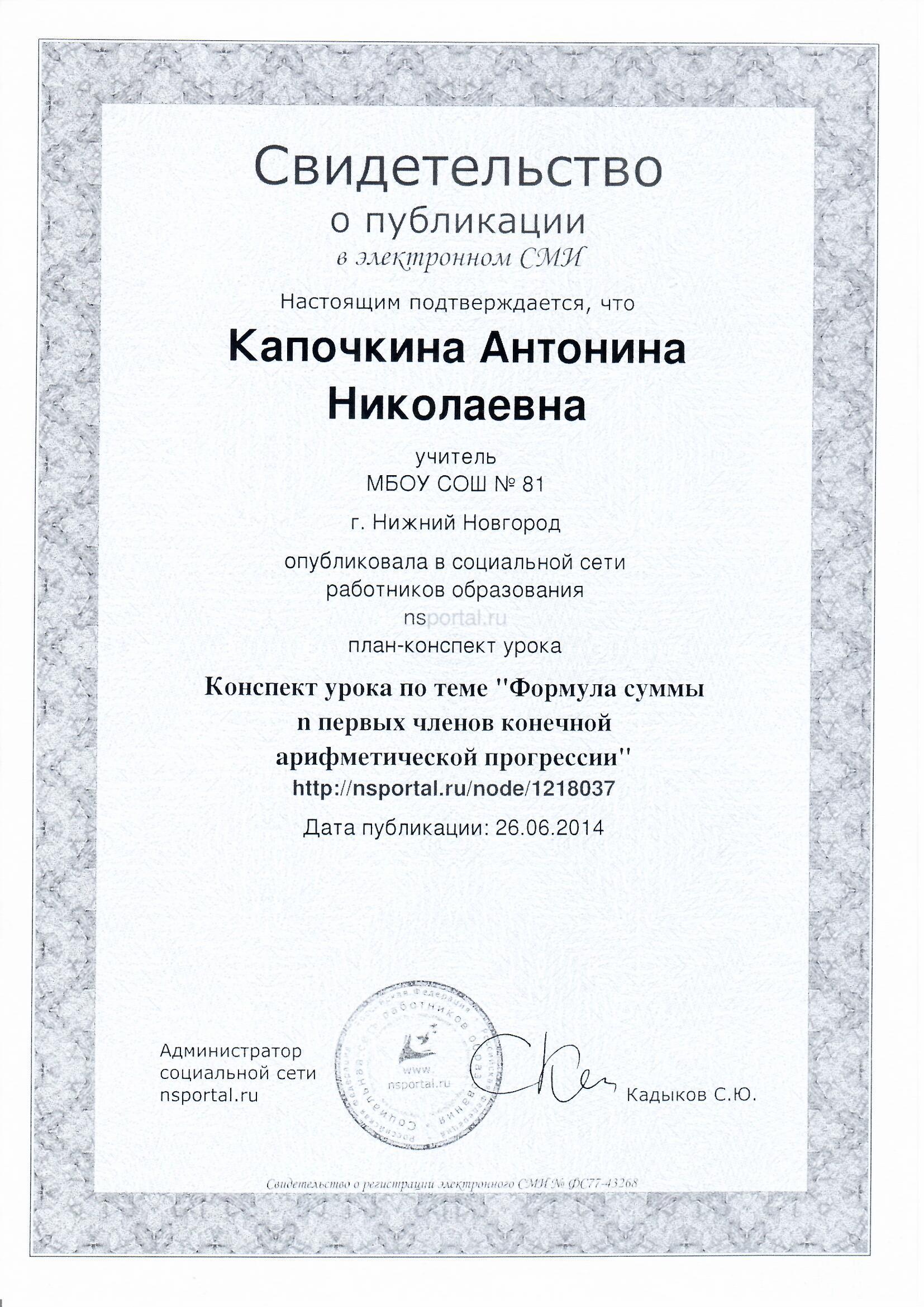 Конспект урока по теме "Формула суммы n первых членов конечной арифметической прогрессии".